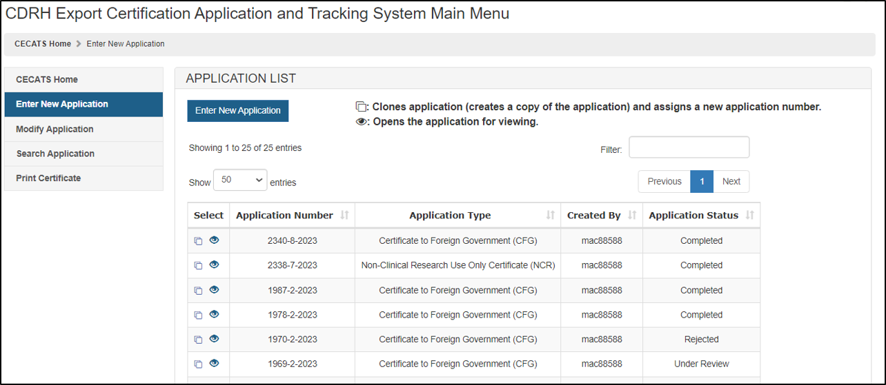 NOTE: Return for Action status indicates that upon review of the application by the FDA, additional information or clarification was required. CECATS will send an email to the requestor with comments from the reviewer and will provide a 48 hour window for modifications to be made. If modifications cannot be made within 48 hours, the status will automatically change to "Incomplete". Please clone, modify, and submit the application when it is ready. A new application number will be assigned. No charges are incurred for an application unless certificates are issued.