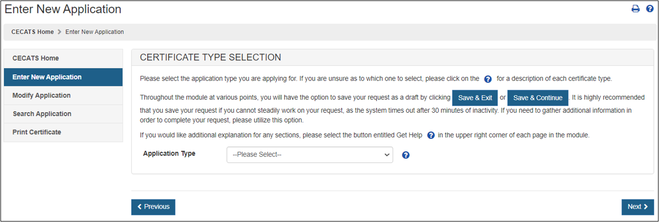 The system auto-populates specific information from your Online Account Administration (OAA) into section 1 (Requestor Information) of the application. These fields cannot be edited in CECATS.