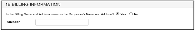 In section 1B: "Is the Billing Name and Address same as the Requestor's Name and Address?" If you select "Yes", you have the option to enter an alternate addressee in the "Attention" field. If you select "No", you may enter an alternate billing address in the fields provided. See Figure 8 and 9.