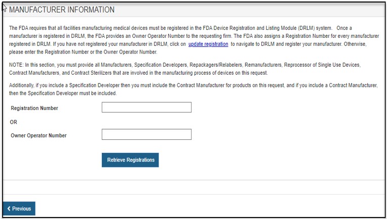 FDA requires that all facilities manufacturing medical devices must be registered in the FDA Device, Registration and Listing Module (DRLM). Once a manufacturer is registered in DRLM, FDA provides an Owner Operator Number (OON) to the requesting firm. FDA also assigns a Registration Number for every manufacturer registered in DRLM. If you have not registered your manufacturer in DRLM, return to the FURLS home page and register your manufacturer in DRLM. Otherwise, please enter the Registration Number or the OON.