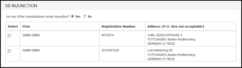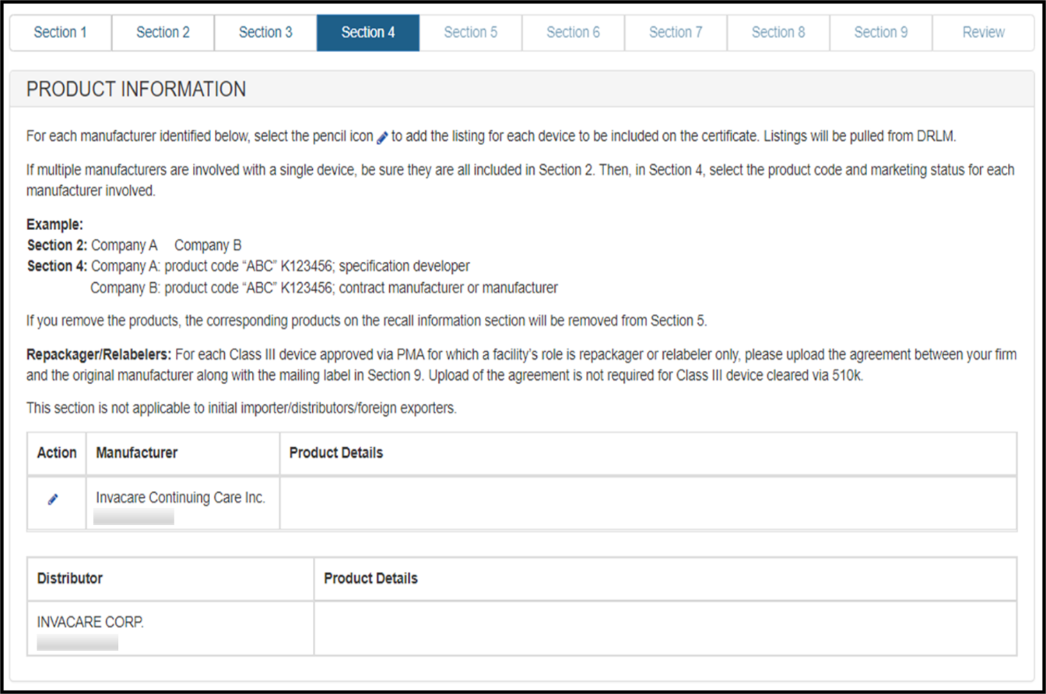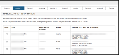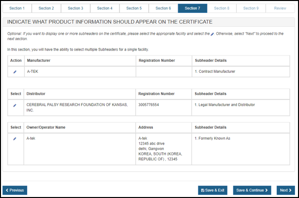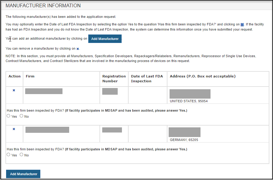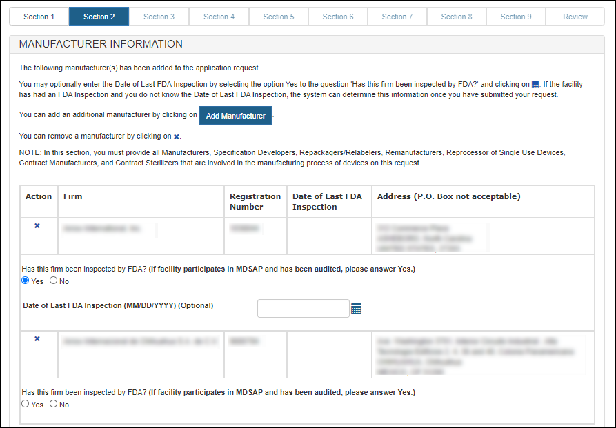NOTE: In this section, you must identify all Manufacturers, Specification Developers, Repackagers/Relabelers, Remanufacturers, Reprocessor of Single Use Devices, Foreign Exporters, Contract Manufacturers, and Contract Sterilizers that are involved in the manufacturing process of devices on this request.