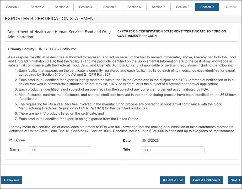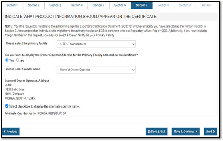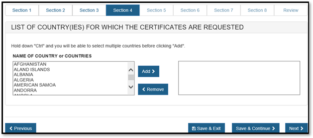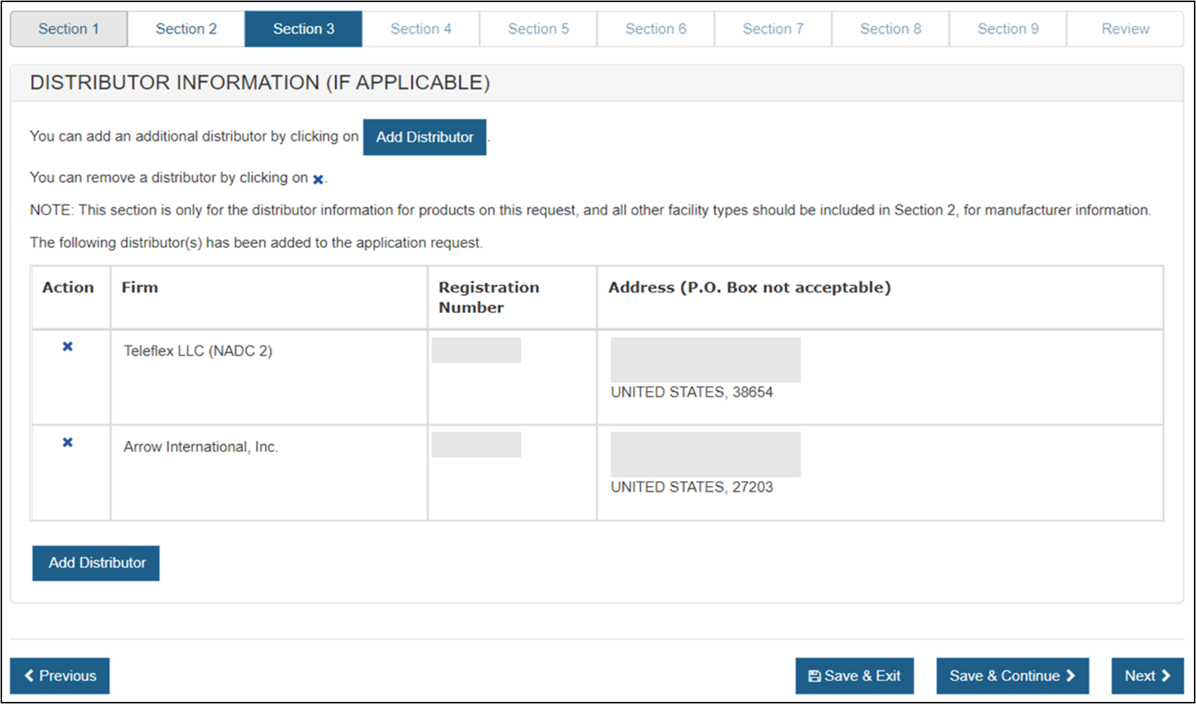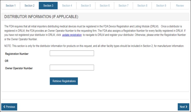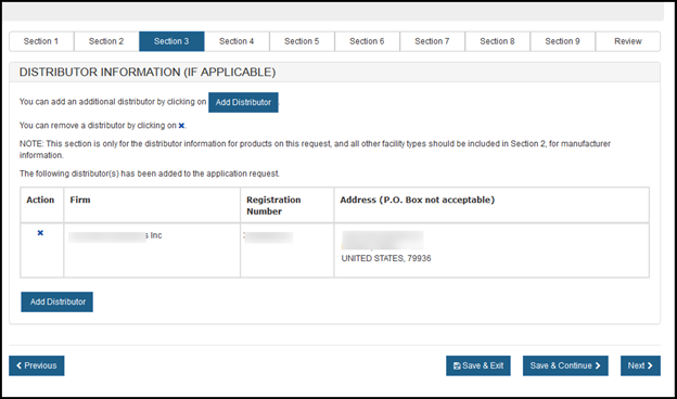 In section 3, you have the option to enter one or more Distributors to your request. This is the U.S. establishment that exports the devices from the United States. Do not include foreign distributors.