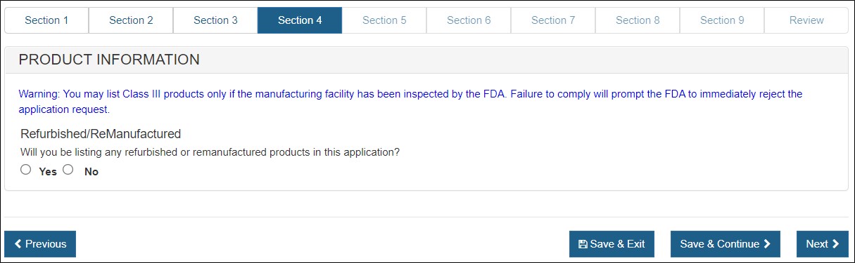 Select "Yes" or "No" to the question(s) regarding refurbished or remanufactured products.