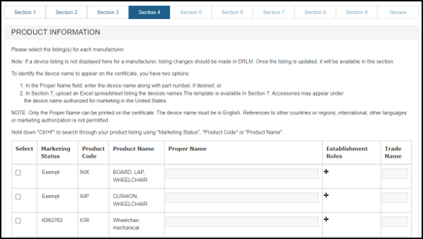 At this point, you have an option regarding the addition of the product name. You can either enter the name of the devices exactly as you want it to appear on the certificate in the "Proper Name" block as shown in Figure 20 below OR you can proceed through the application to Section 7 and upload a Product List. If you would like to include product codes or parts/accessories to the product listing, do not indicate a "Proper Name" in this section. Instead (in section 7), upload the product information using the formatting outlined in that section.