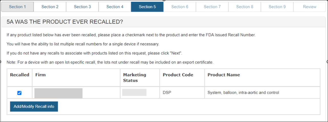 After selecting the checkbox next to the product, a new button will appear. Click on the "Add/ Modify Recall Info" button as shown in Figure 21.