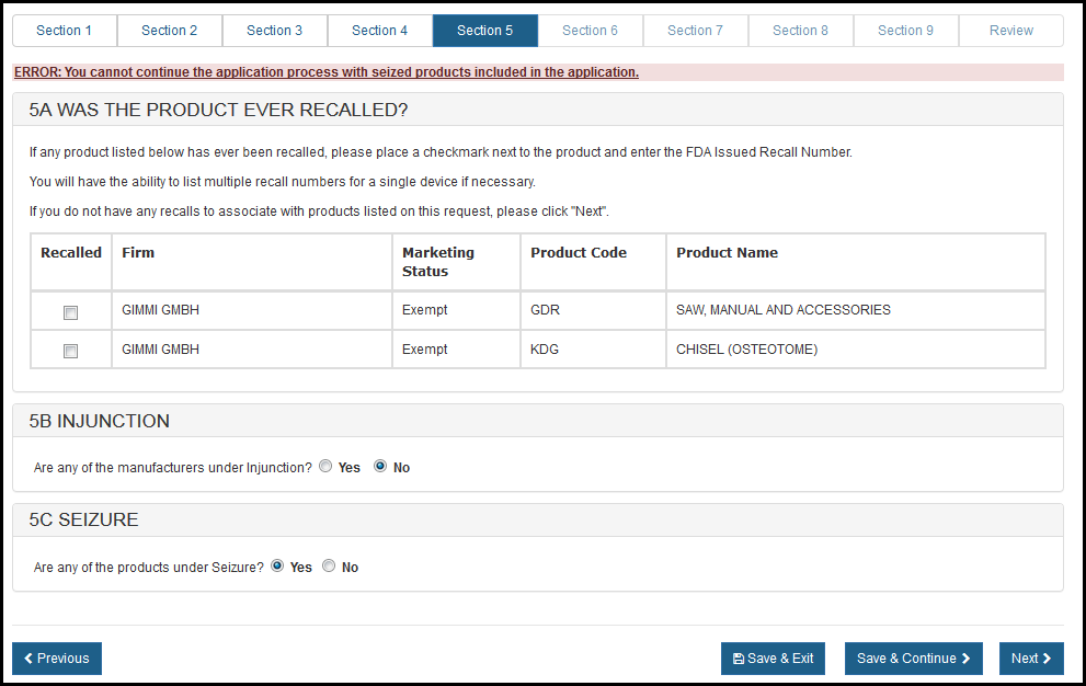 IMPORTANT: If any product is not listed on the facility's establishment registration, the facility will need to update their DRLM registration before you can continue.