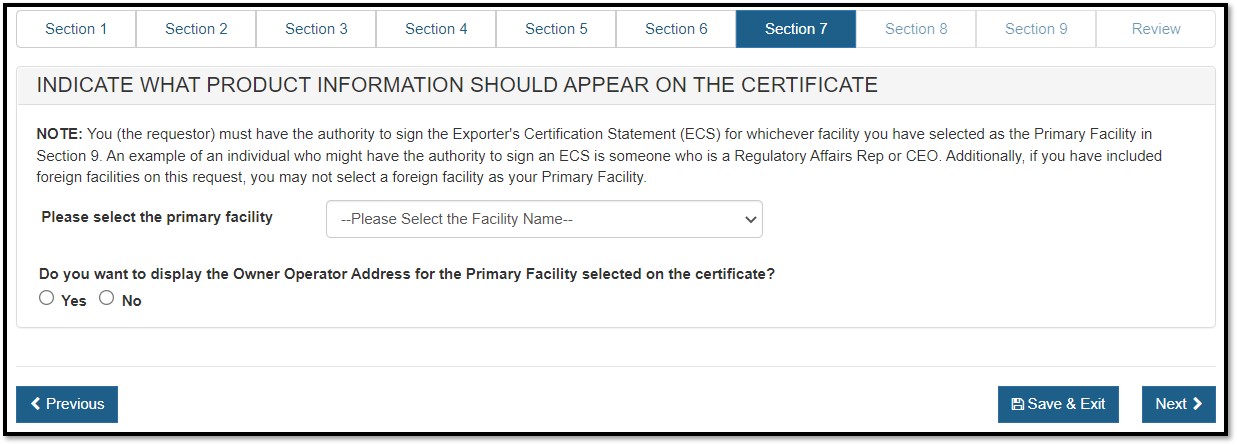 the manufacturing facility's address, later in the process. Click "Next" to proceed. See Figure 10