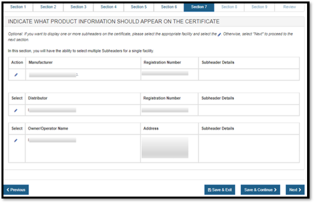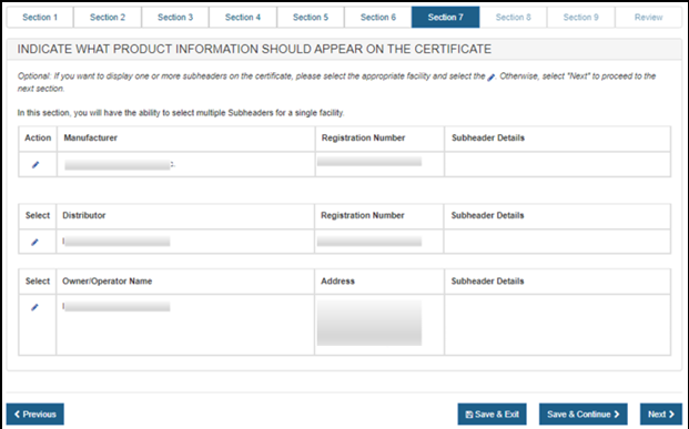 Warning: All information will be deleted if you click on the "Restart Step 7" including the Primary Manufacturer, Owner Operator Address, and all identified facilities to be displayed on the certificate, Header and SubHeader selections, and the product listing.