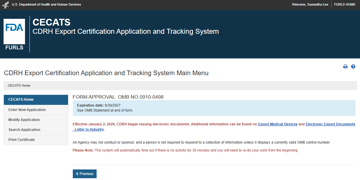 Log into the FDA Industry Systems (FIS) https://www.access.fda.gov and select "CDRH Export Certification Application & Tracking System (CECATS)" from the list of systems available on the FURLS Home page as shown in (Figure 1).