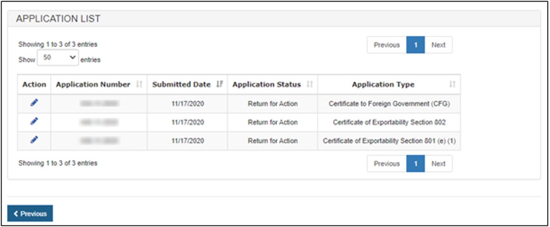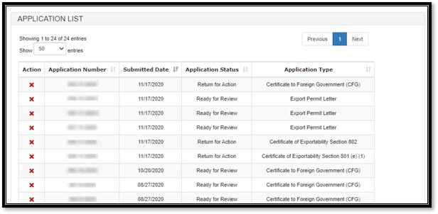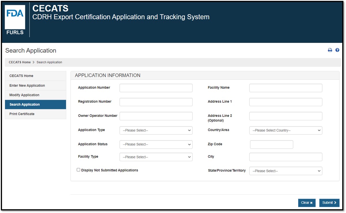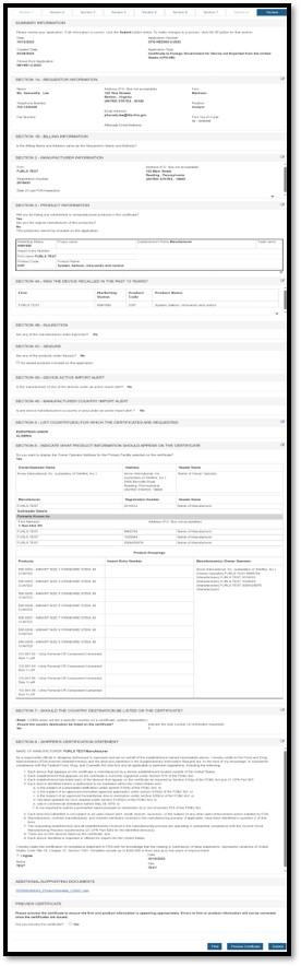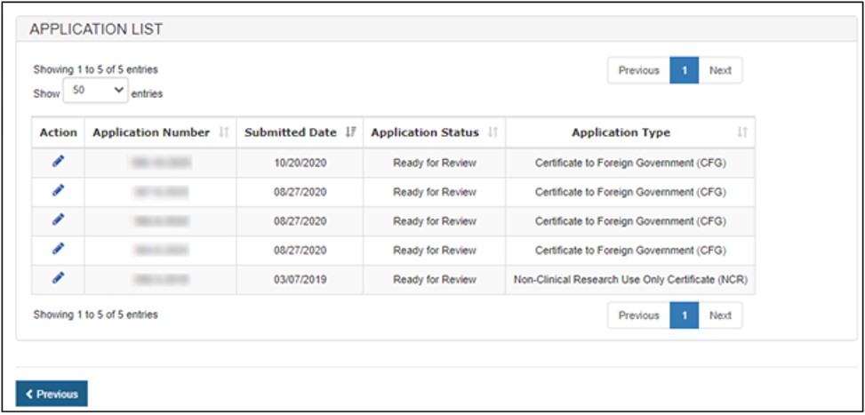 icon If the application is in Return for Action status, after selecting the Edit icon To clone the application, select the Clone (double book) icon The cloning feature allows a user to copy any submitted application. Once cloned, the user will have the ability to update any or all sections of the application prior to submission. NOTE: To clone an application, NOTE: If your list of applications becomes too large, the Search function is a viable option to quickly locate a specific application. You can also use Ctrl+F to search for the application while on the "Enter New Application" screen. Before submitting the application, click "Preview Certificate" to ensure the firm and device information appears as desired. When your application is ready for submission, click "Submit". Once submitted, you will receive an email stating your application was successfully submitted. NOTE: Please save the application number for future reference. The application number will be required to check the status of your application. Figure 7: Enter New Application
