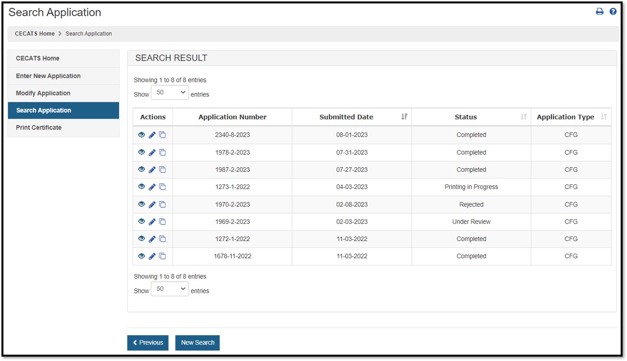 To search for an application, click "Search Application" menu option from the CECATS or CFG-NE "Home" page, as shown in Figure 4.