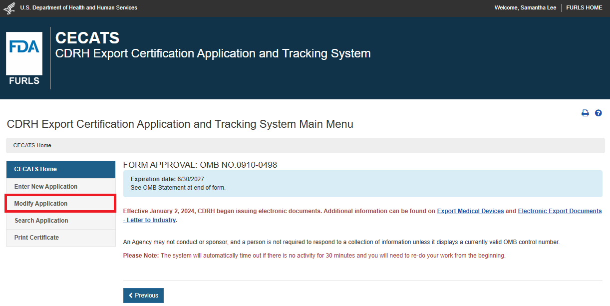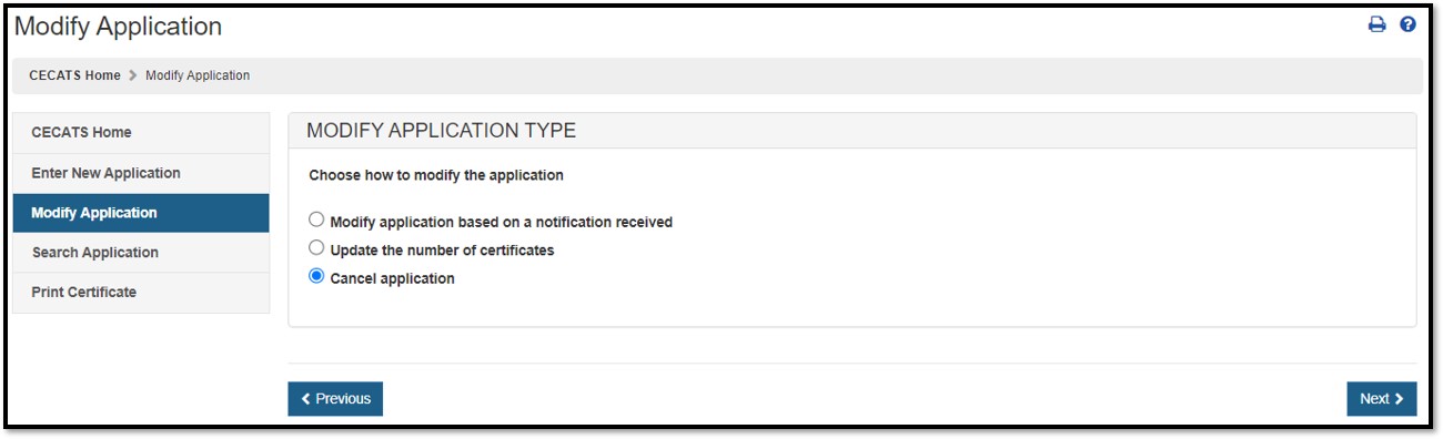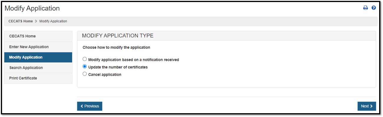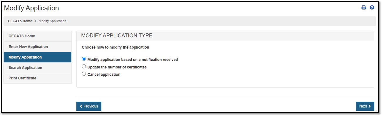 Select the "Modify Application" menu option from the CECATS or CFG-NE "Home" page, as shown in Figure 8. Figure 8: Modify Application